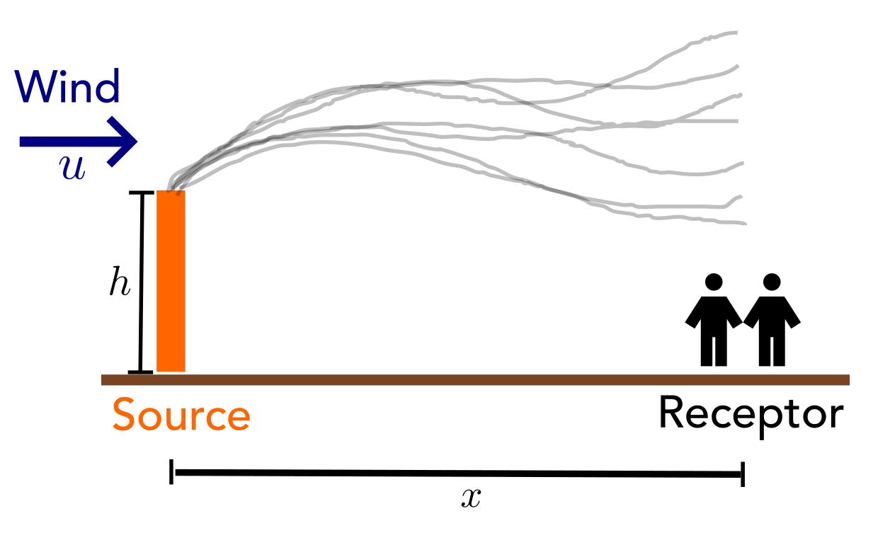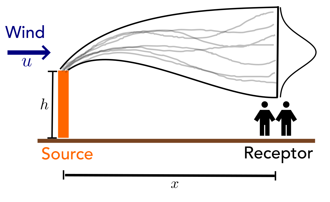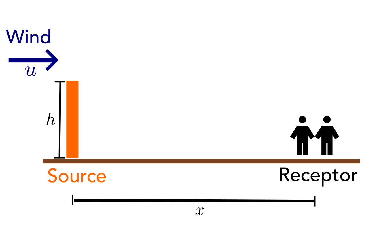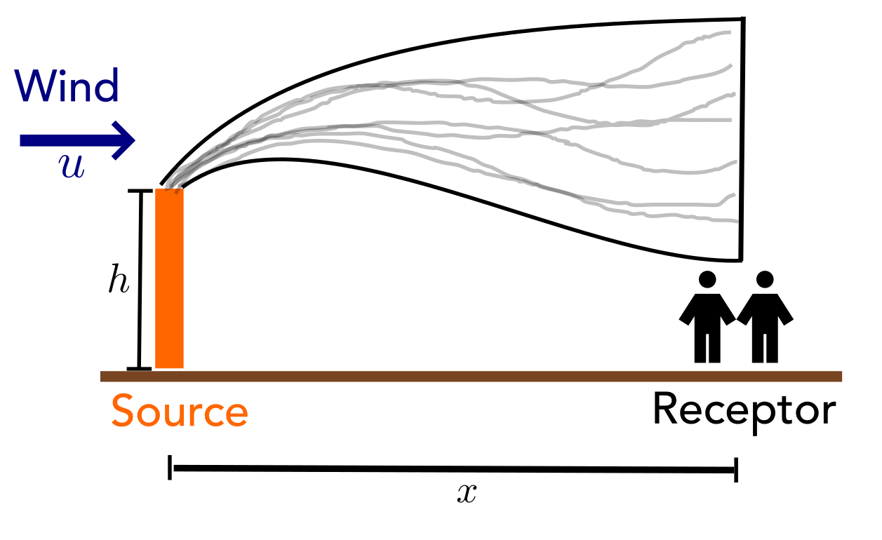 Note: here \(x\) is in km, while in the plume equation \(y\), \(z\) are in m!