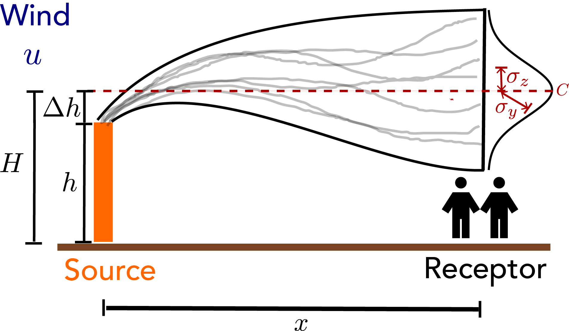 \[\begin{aligned} C(x,y,z) = &\frac{Q}{2\pi u \sigma_y \sigma_z} \exp\left(\frac{-y^2}{2\sigma_y^2} \right) \times \\\\ & \quad \left[\exp\left(\frac{-(z-H)^2}{2\sigma_z^2}\right) + \exp\left(\frac{-(z+H)^2}{2\sigma_z^2}\right) \right] \end{aligned}\]